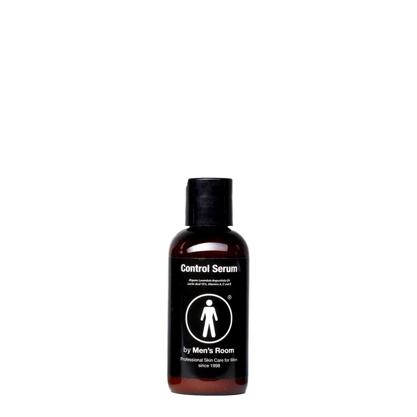 Control Serum by Mens Room er unik til hjemmebrug, både eksfoliering og problembehandling. Serummen kræver gradvis tilvænning over 1 til 2 uger. Control Serum indeholder 15 % mælkesyre med en pH-værdi på 3,8, der laver en mild daglig peeling uden at skade hud og blodkar. Tilstopninger fjernes, så tørhed, hudorme, indgroede hår (skægpest) og akne vulgaris afhjælpes. A-, C-, E-vitamin og Q10 stimulerer til heling i synergi med mælkesyre, der er et cellesignalstof, der øger hudens egen regenerering. Vand bindes i huden, så hudens barrierefunktion optimeres. Produktet kan bruges med god effekt på alle hudens ubalancer, idet den skaber et ideelt helingsmiljø.