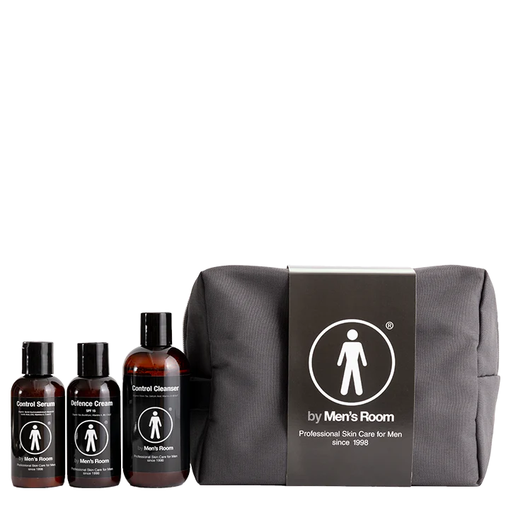 Det Stærke Sæt by Men’s Room er en behandlende og hudforbedrende trio: Step 1: Grundrensende vaskegele, Control Cleanser 237 ml. Step 2: Eksfolierende og hudforbedrende Control Serum 50 ml. (læs særlig vejledning) og Step 3: Beskyttende Defence Cream, 59 ml. der støtter hudens opheling. Spf.15.